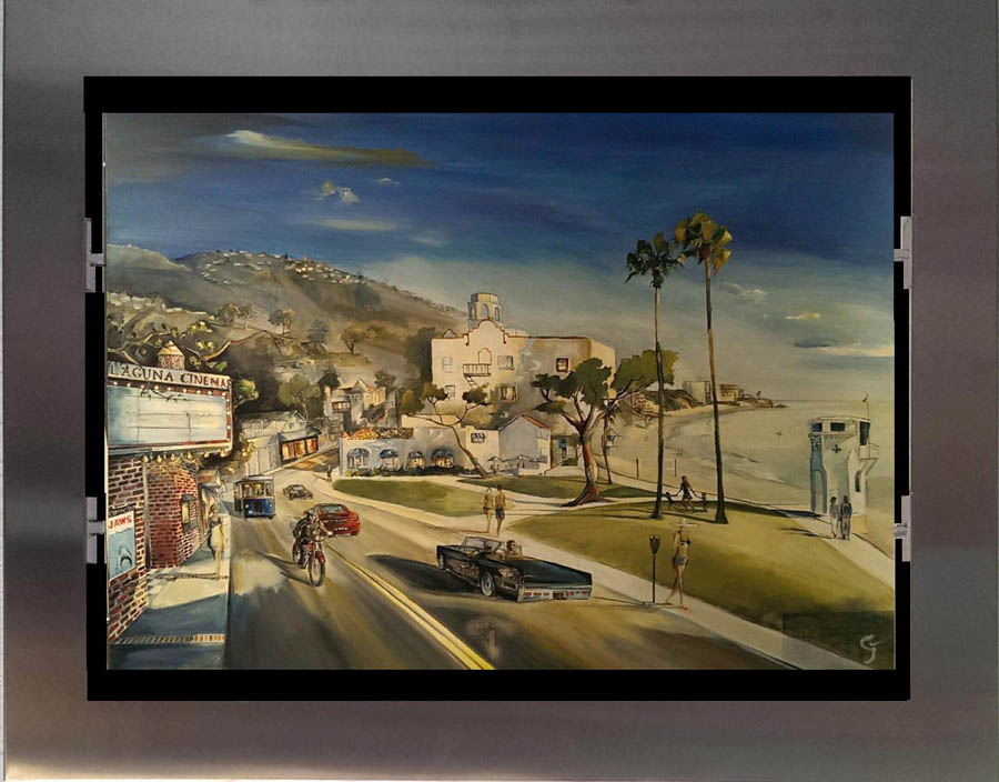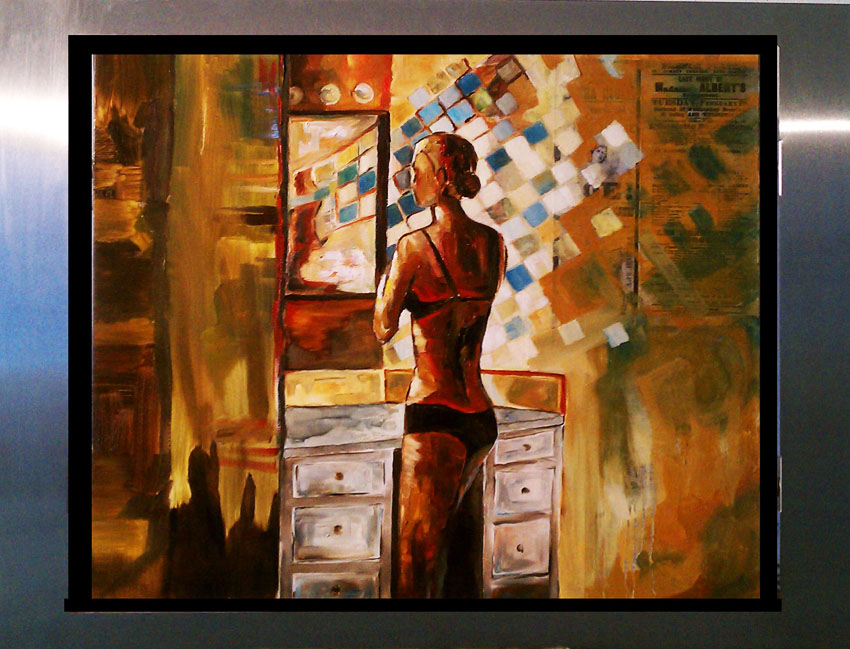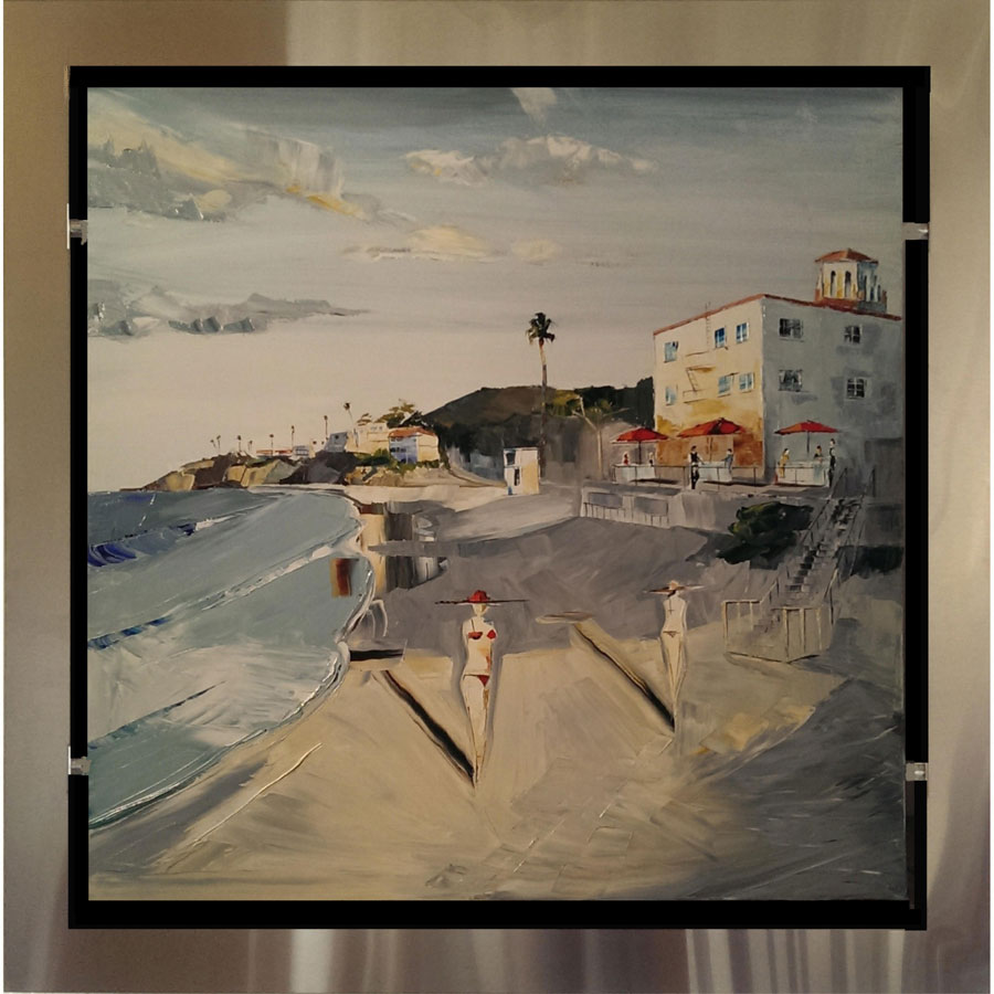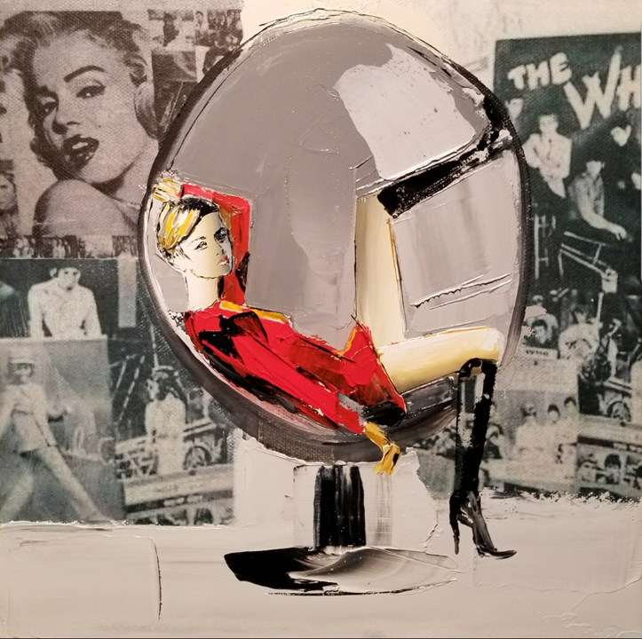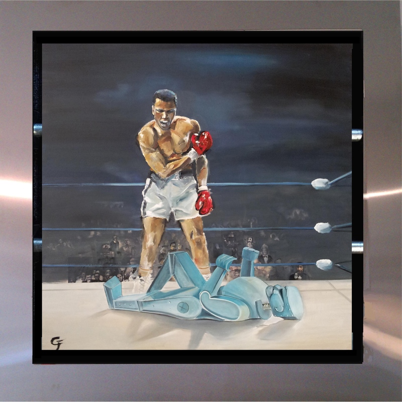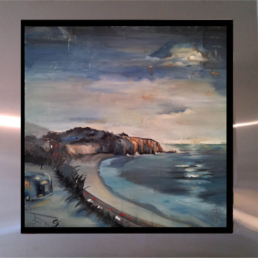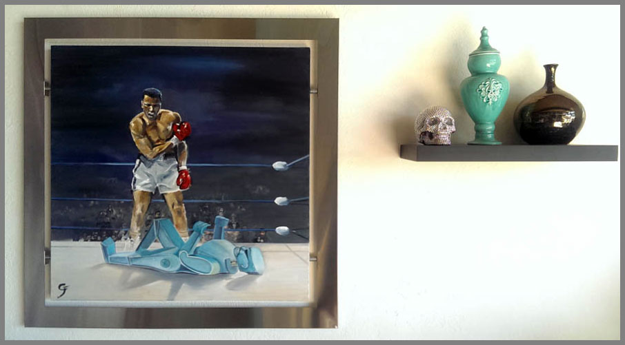 the subject matter over in oil. Each piece is floated in his custom-designed stainless steel frame.