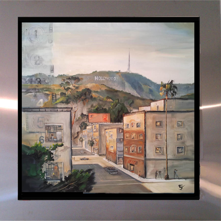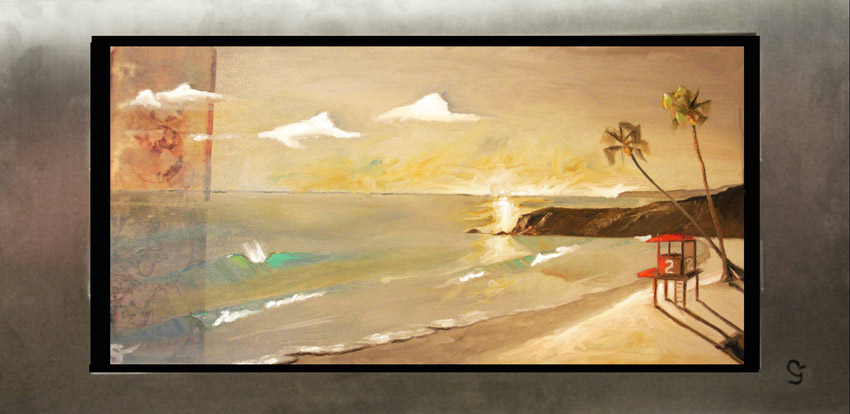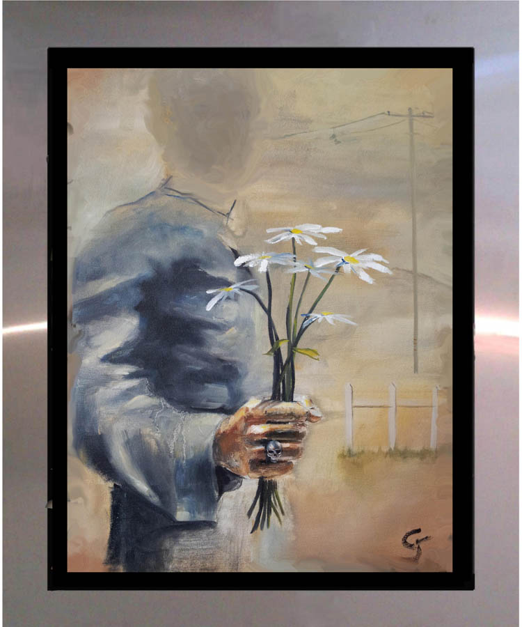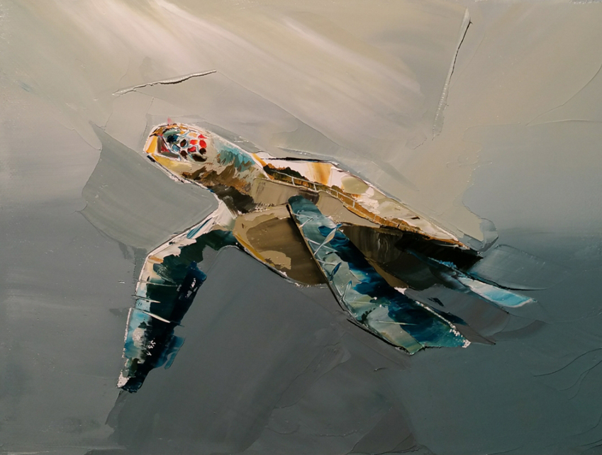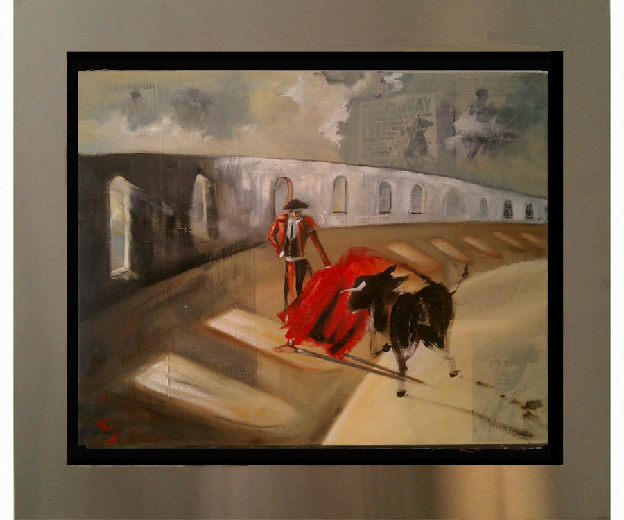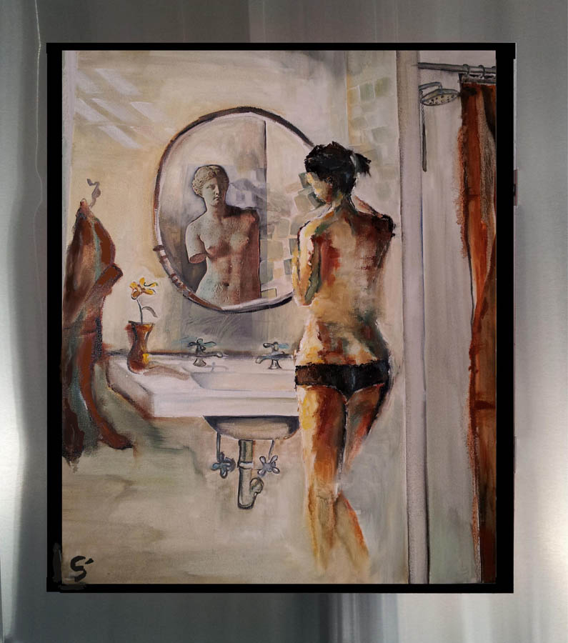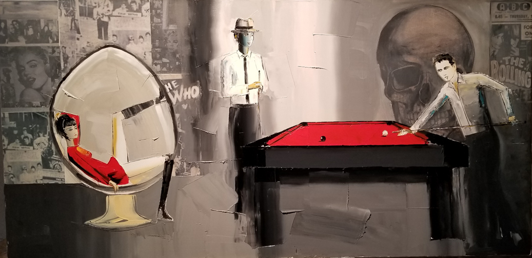 the subject matter over in oil. Each piece is floated in his custom-designed stainless steel frame.